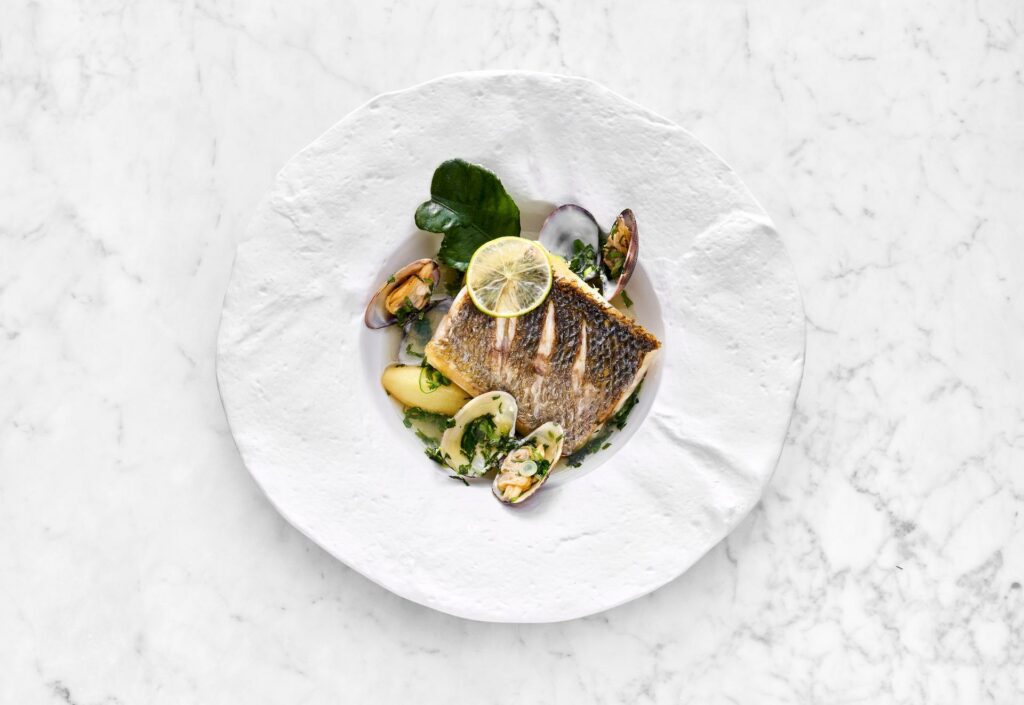 • Filet de saumon poché avec crevette sauce crémeuse au vin blanc